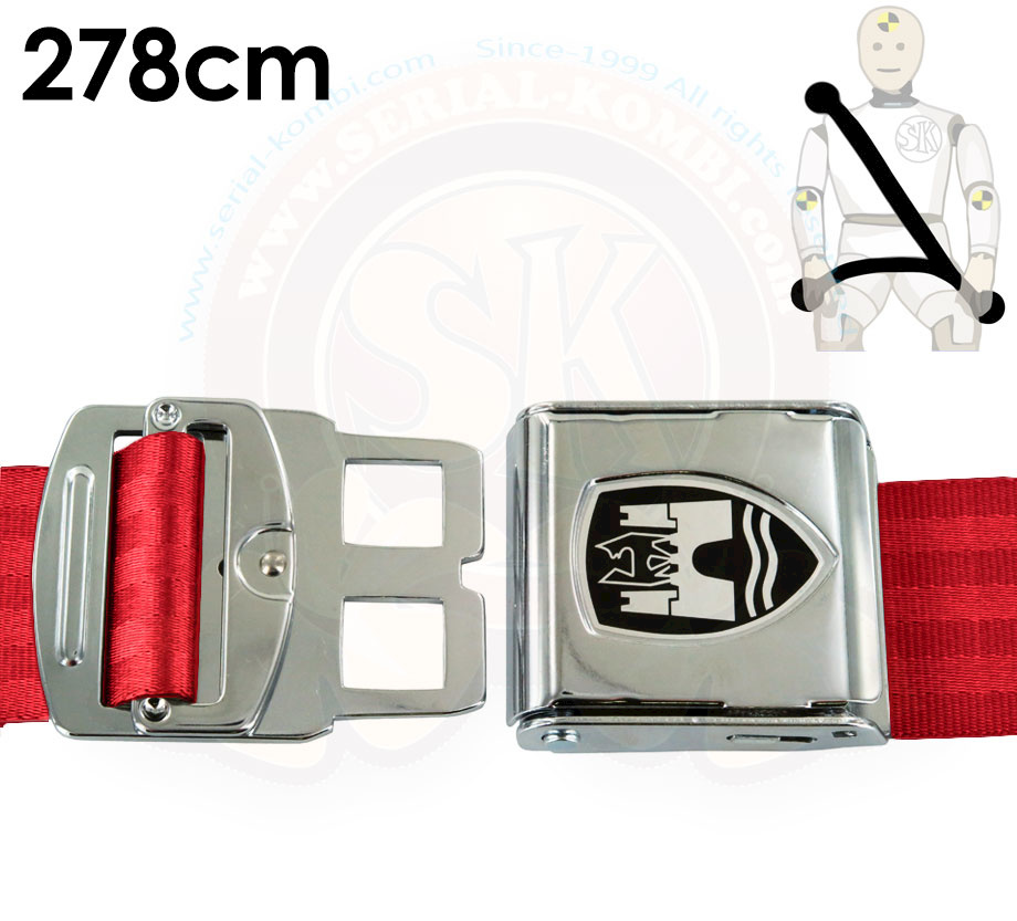 3- Punkt Sicherheitsgurt, rot, Flugzeugschnalle verchromt, Wolfsburg Logo