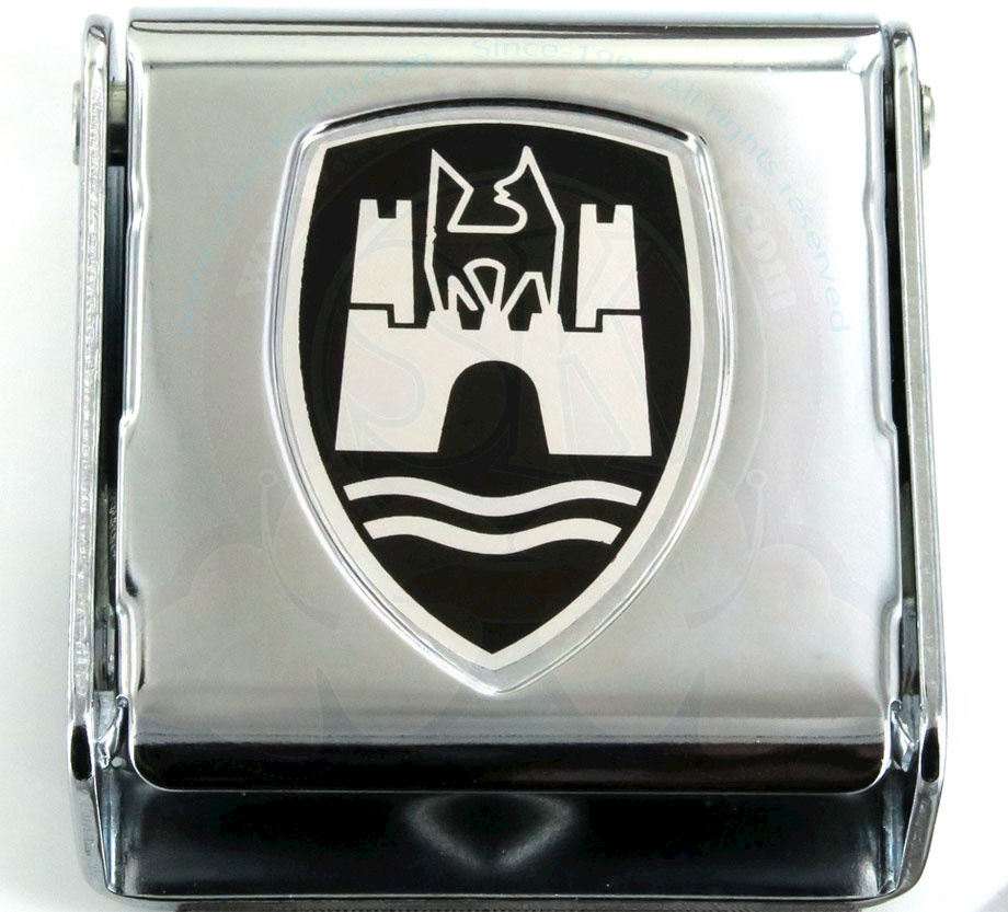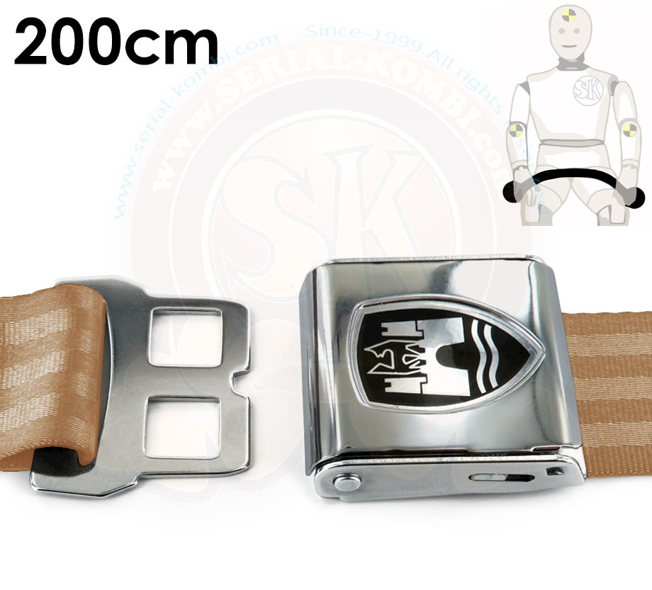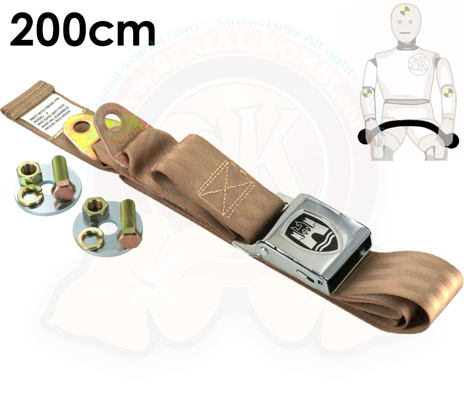 Beckengurt, Sicherheitsgurt, Mittelbank, hellbraun, Flugzeugschnalle verchromt, Wolfsburg Logo