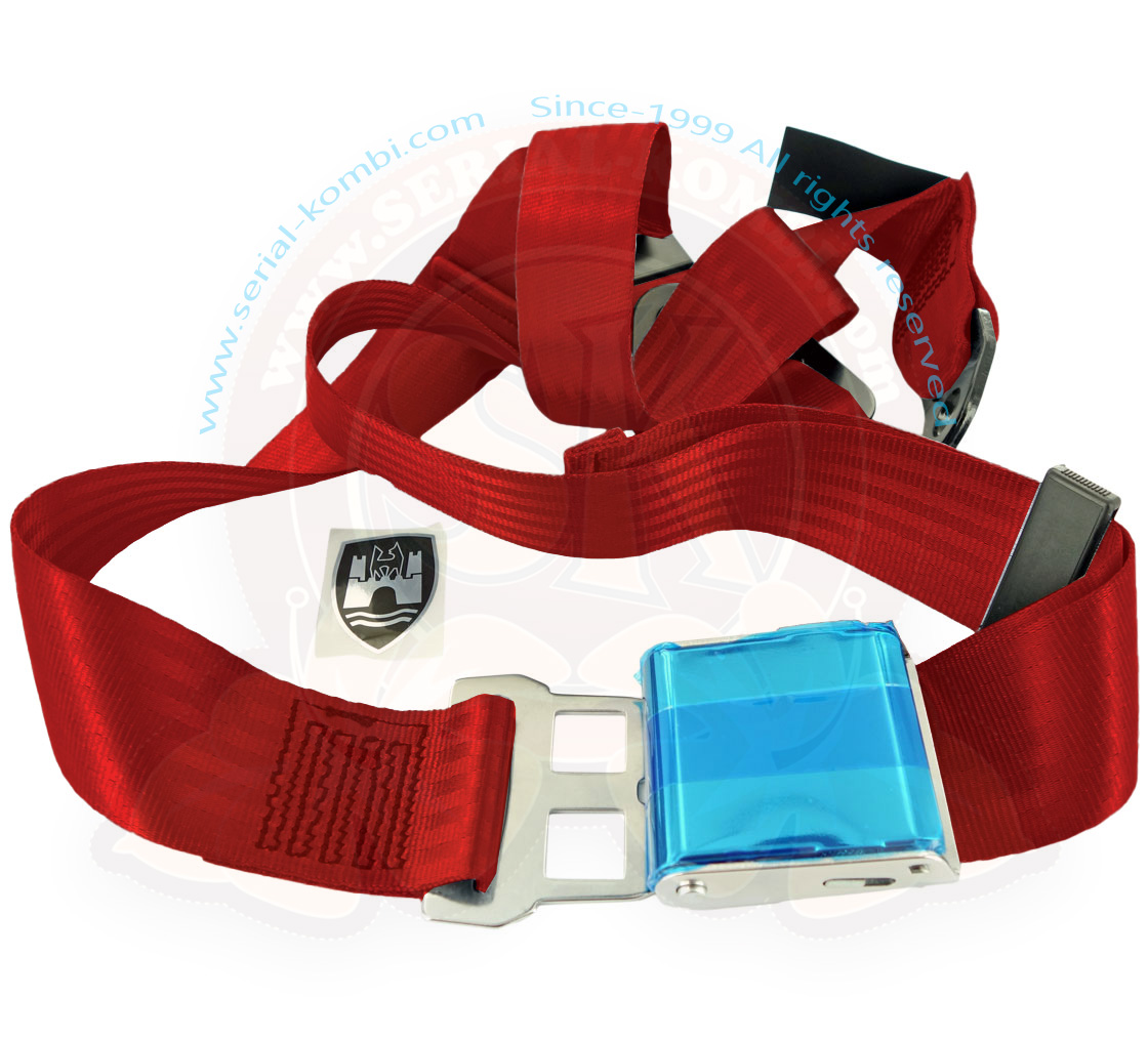 Beckengurt, Sicherheitsgurt, „spezial Mittelbank“, rot, Flugzeugschnalle verchromt, Wolfsburg Logo