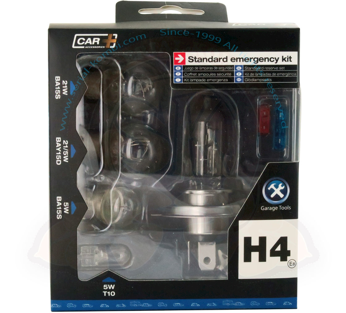 Sicherheitslampen-Set bestehend aus Lampen mit den Fassungen P21W, P21/5W, W5W/T10, R5W und zwei Sicherungen mit 10 und 15 Ampere.