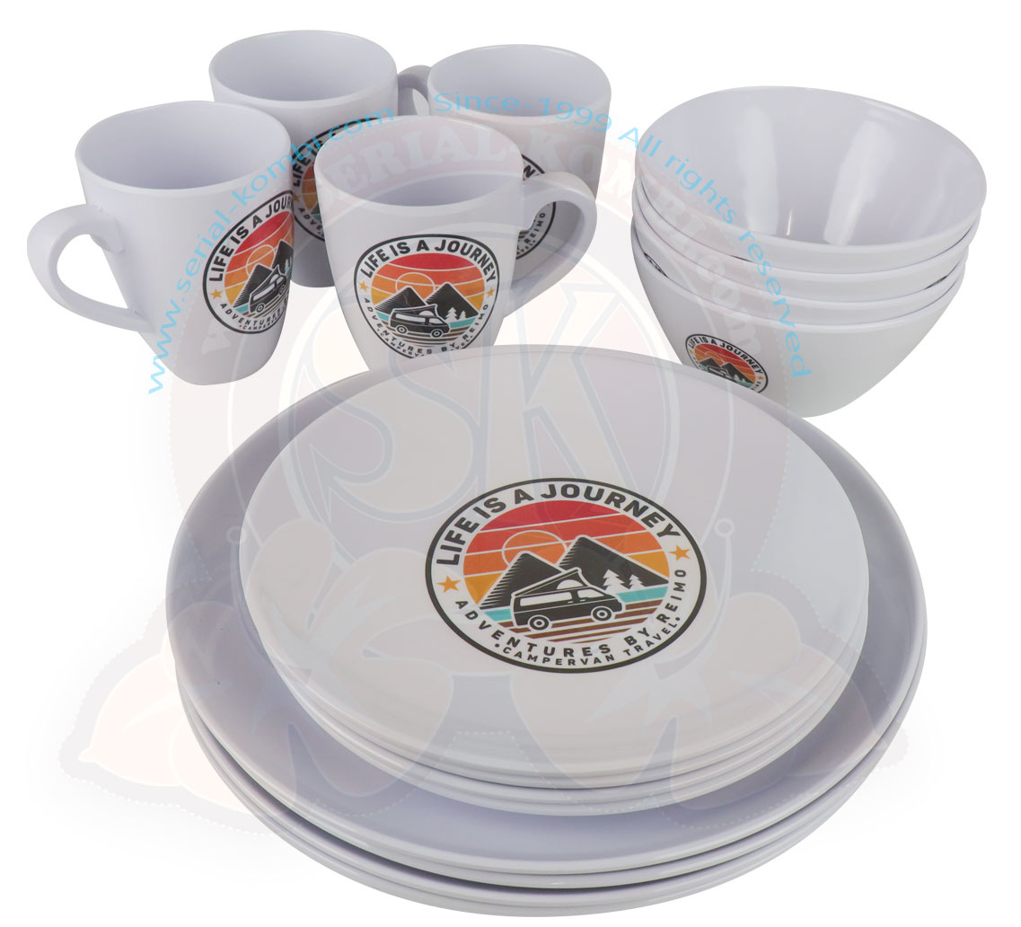 Geschirrset aus Melamin, 16-teilig für 4 Personen, mit Camper-Motiven “ Life is a journey “ 4 Teller, 4 Desertteller, 4 Schüsseln, 4 Tassen