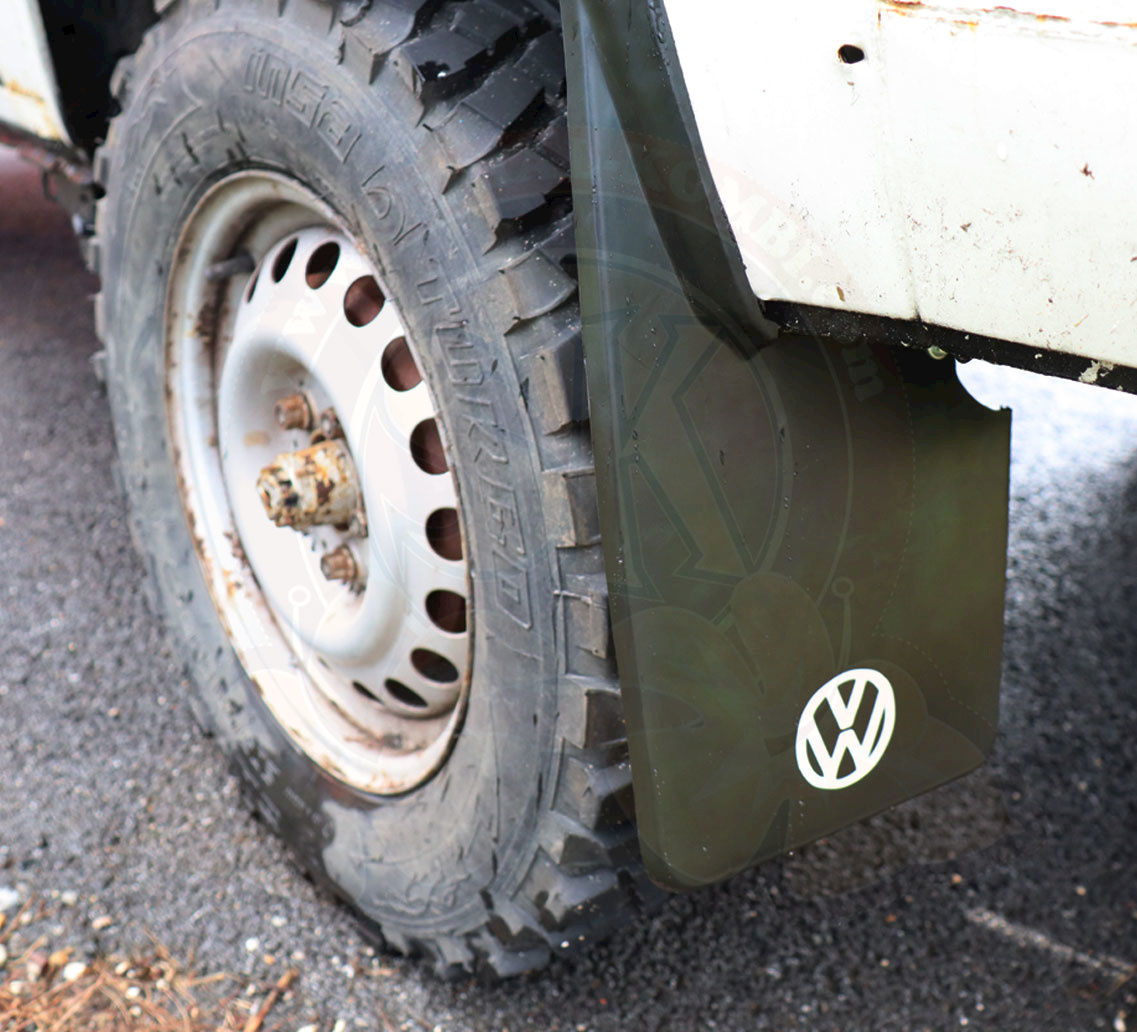 Schmutzfänger VW Südafrika, das Weiß des Logos ist nicht perfekt und befindet sich links und rechts an unterschiedlichen Stellen, wie auf den Fotos zu sehen ist.