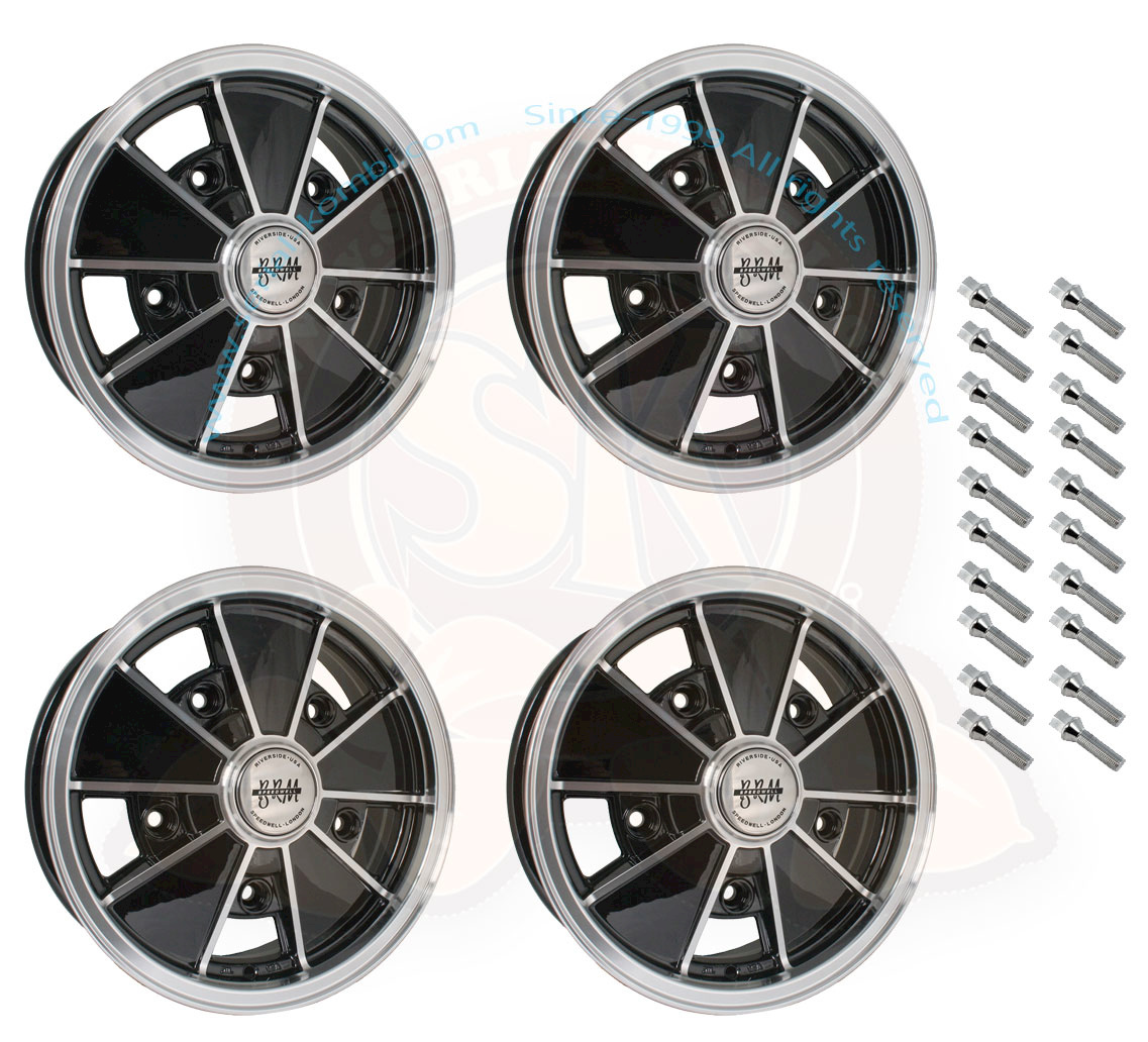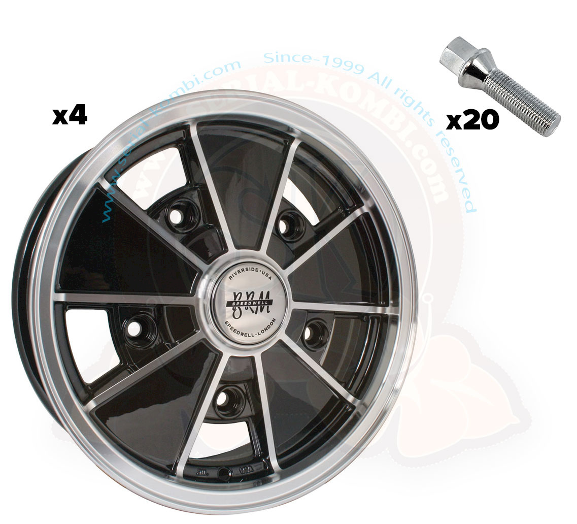 Satz aus 4 Felgen mit 4 Nabendeckel, verchromtes Schaftventil und 20 Radschrauben für alle Busse 1950-7/1970.
