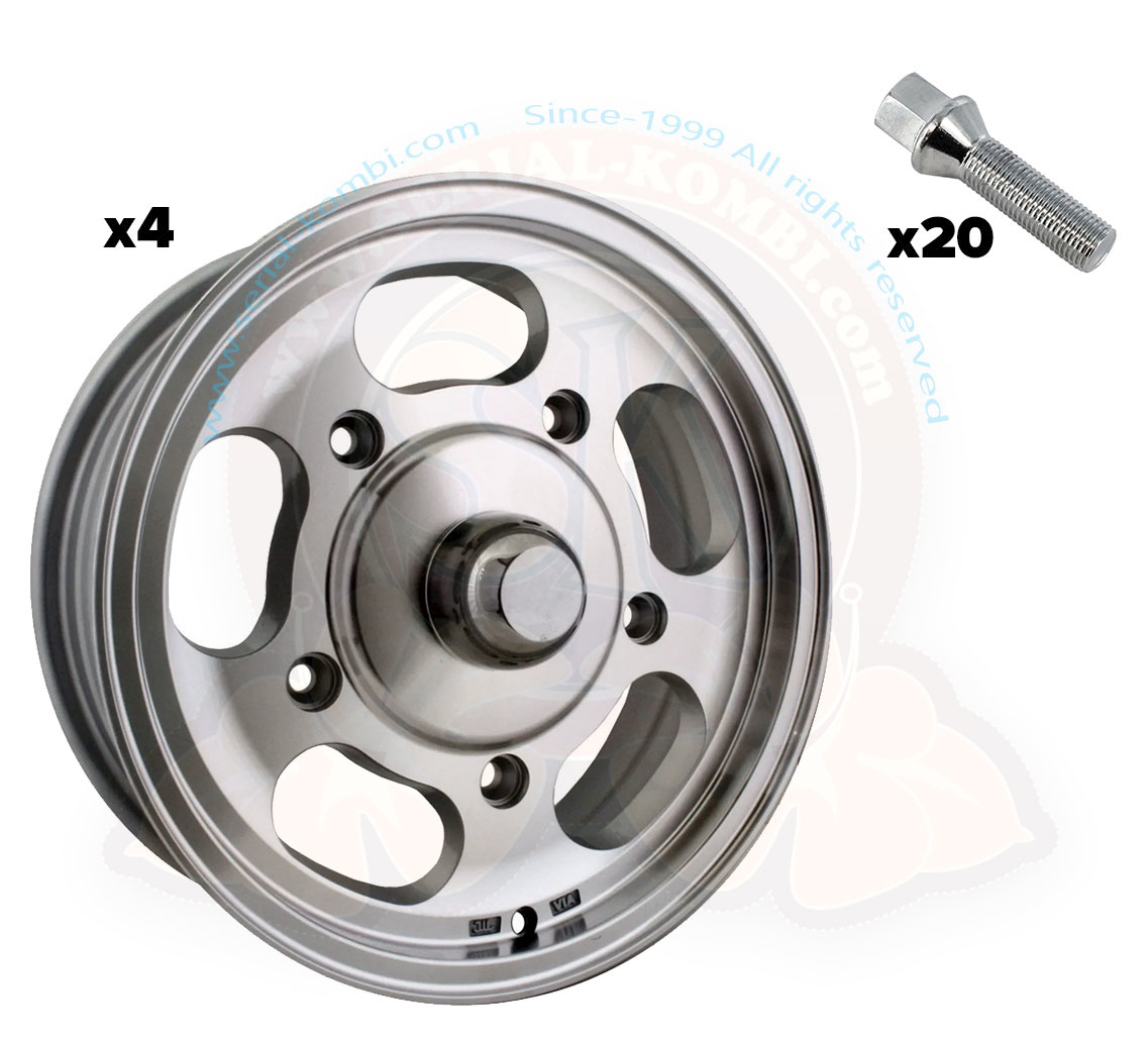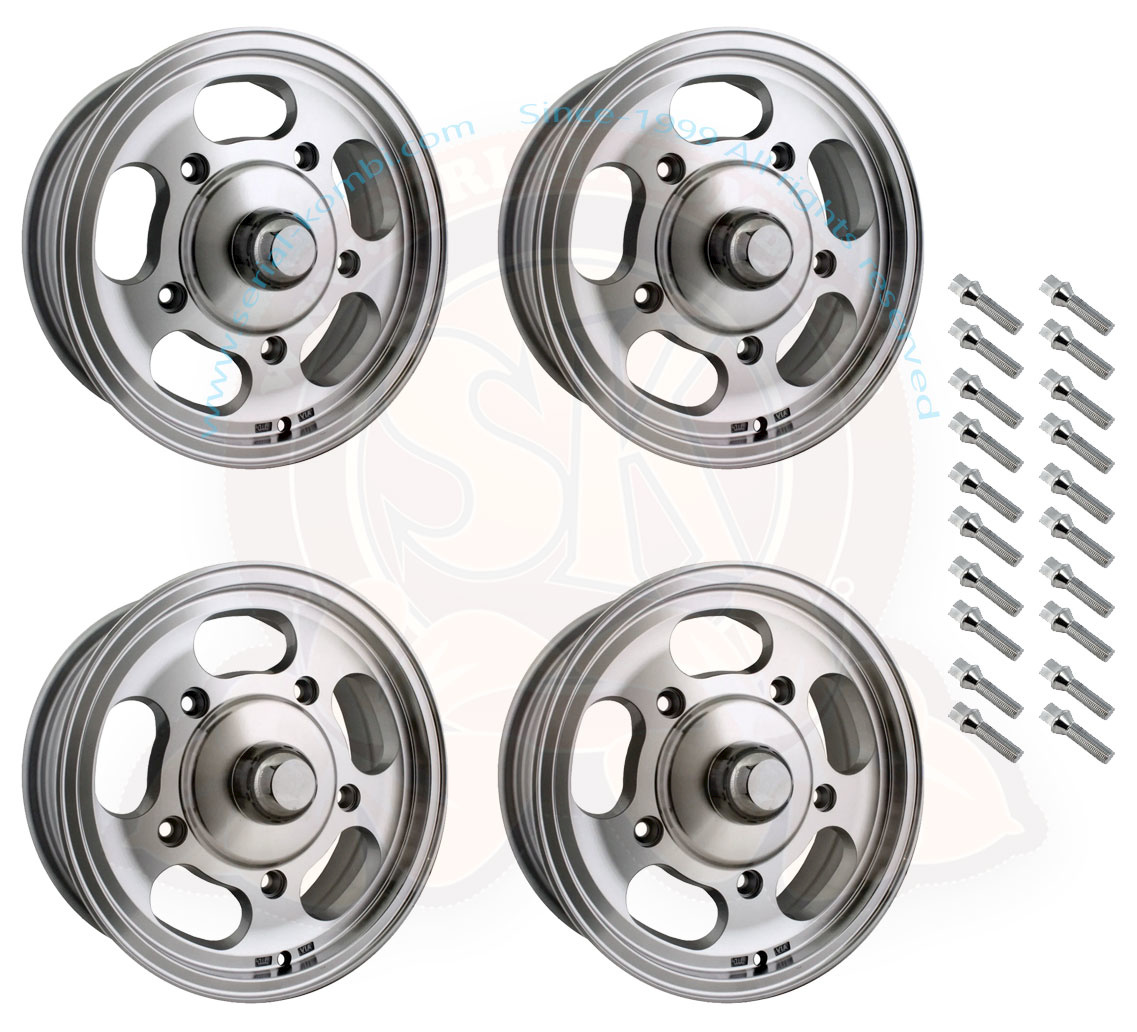 SSP Felge, Schlott Mag, LK 5×205, poliert, 5.5×15″ ET23, 1950-7/1970 Satz aus 4 Felgen mit Nabendeckel, 20 Radschrauben