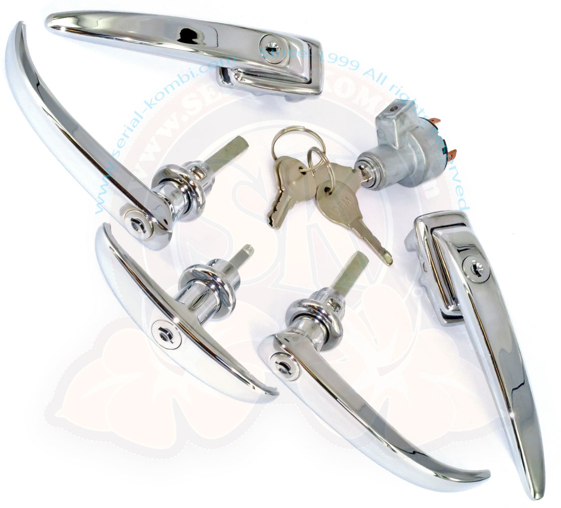 Für Split Window 12/1960-7/1963 (705 620 >). Dies ist ein kompletter Satz neuer Griffe mit einem Schlüssel passend für alle Schließzylinder
