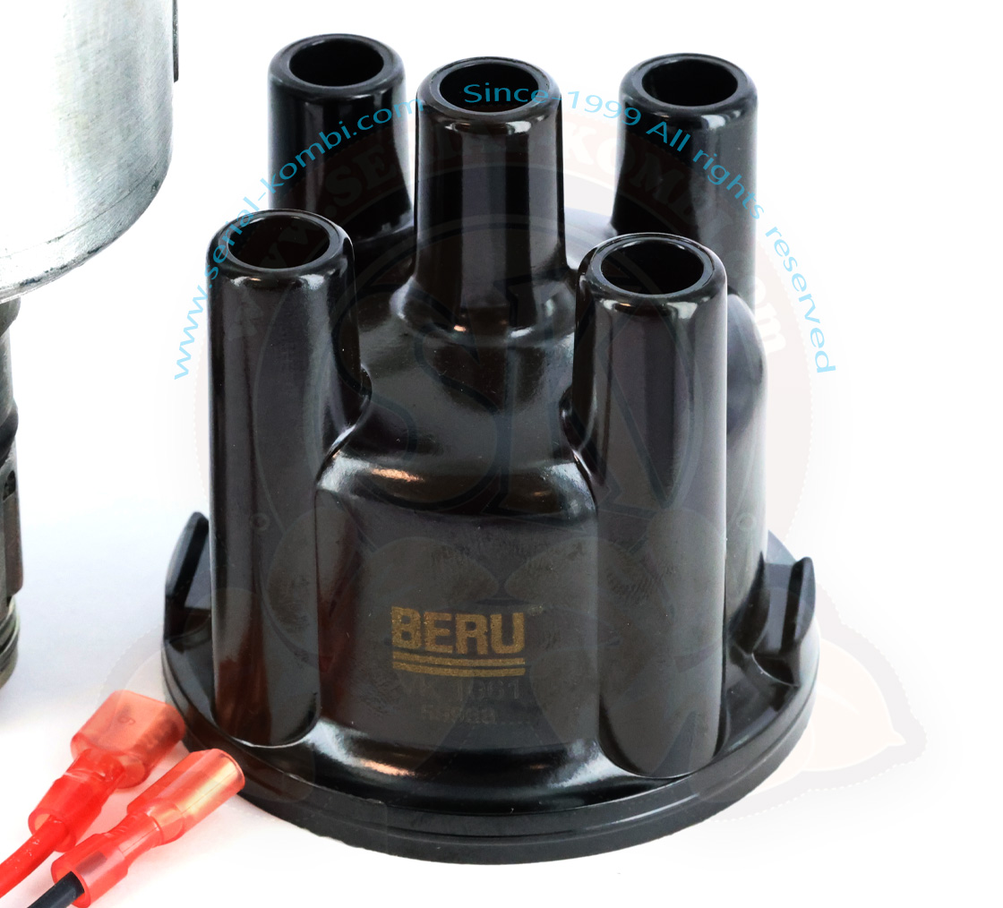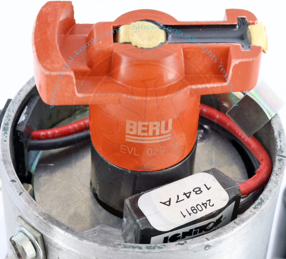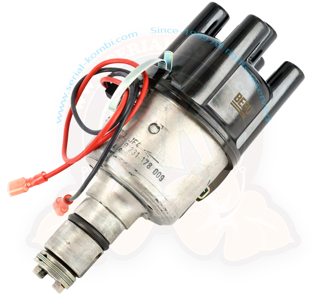 Dieser überholte Zündverteiler wurde sorgfältig zerlegt, gereinigt, überprüft und je nach Verfügbarkeit mit neuen Bosch- oder Beru-Teilen ausgestattet: Kopf, Finger (Rotor), Fußdichtung, zusätzlich mit einem Pertronix-Modul, das die Kontaktgeber und den Kondensator ersetzt.