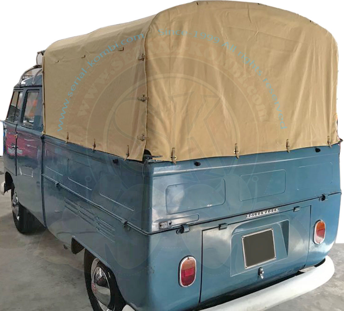 We have tried our best to make our reproduction the same grade cotton canvas as the originals with a high index waterproof layer on the inside, water-splashing-proof on the outside and also with pre-shrinking treatment to standardize the shape of the canvas. However, due to the nature of cotton canvas, if you decide to use your pick up with the canvas on under all weathers, we suggest that you’d better apply some waterproof spray on the outside of your canvas while it is completely dry, and also to keep all the eyelets on all sides of the canvas securely attached onto all metal loops on all drop gates as long as possible while using the canvas on your Pick Up for the first few months to allow it to settle down, especially when it is raining or in moist conditions, as VW would have recommended with their original canvases initially. You may repeat applying waterproof spray as required.