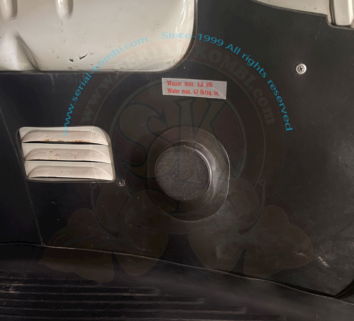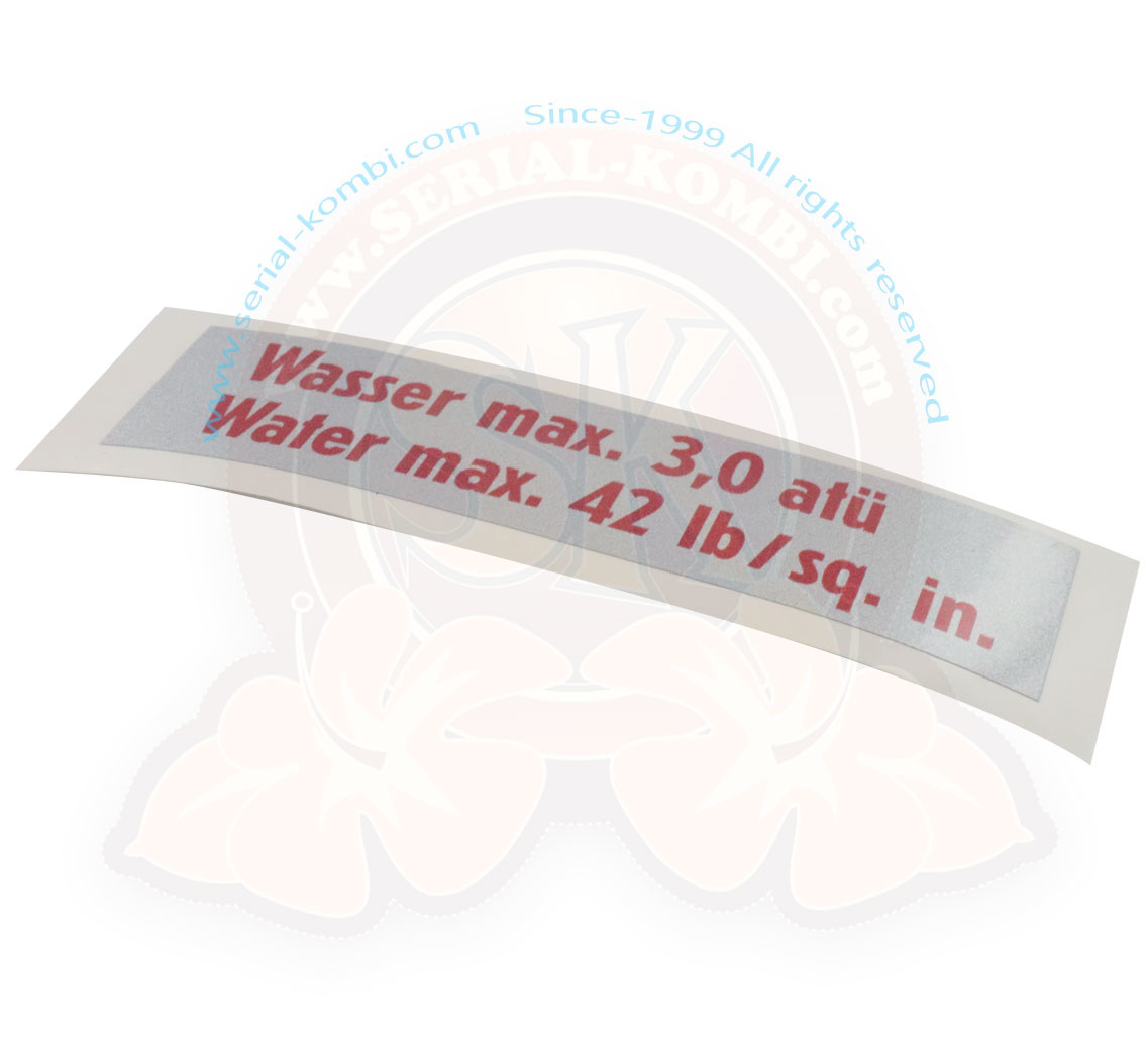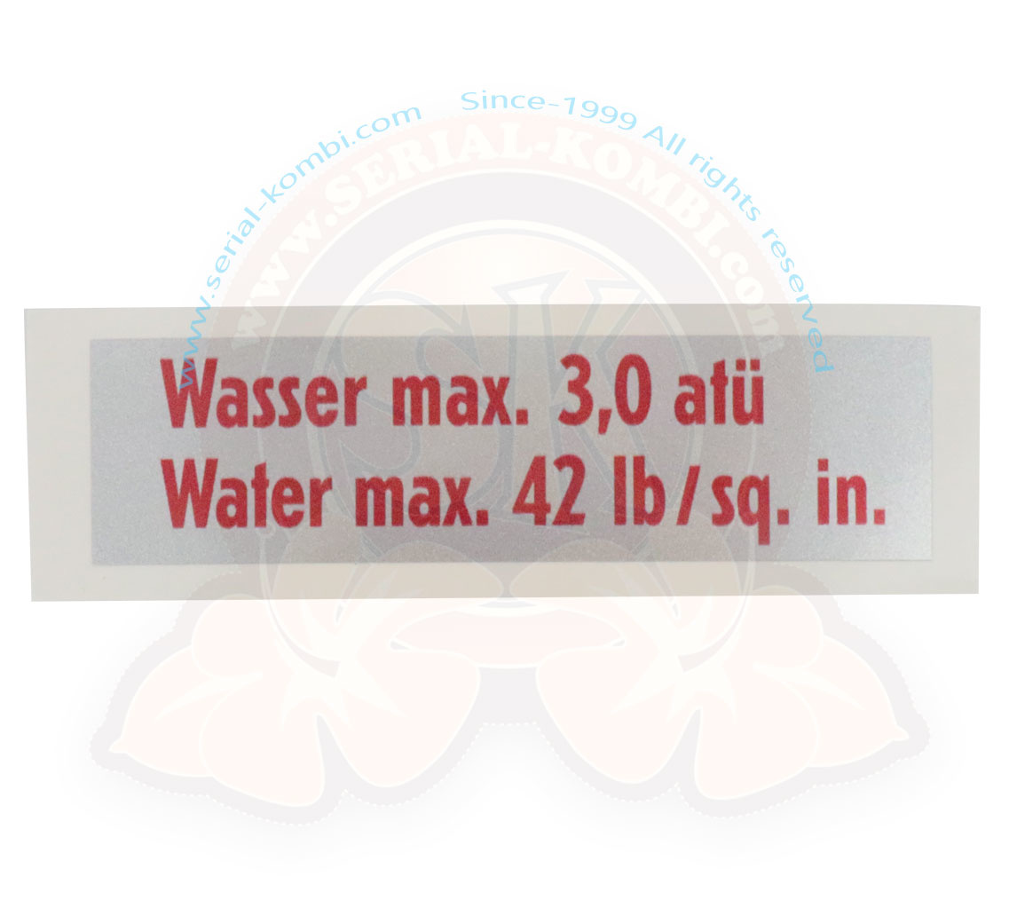 Sticker ‘Water max. 42 lb / sq. in.’ for kick panel on passenger’s side (washer bottle), 2×7.5cm, 8/1967-7/1979