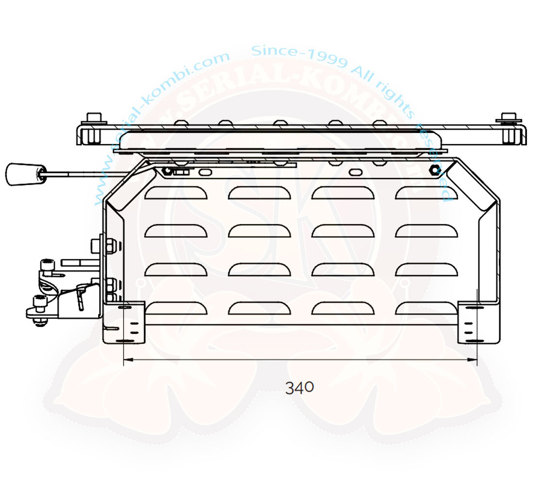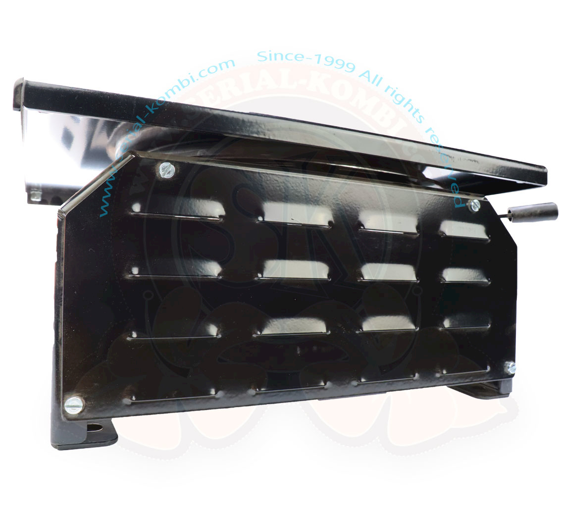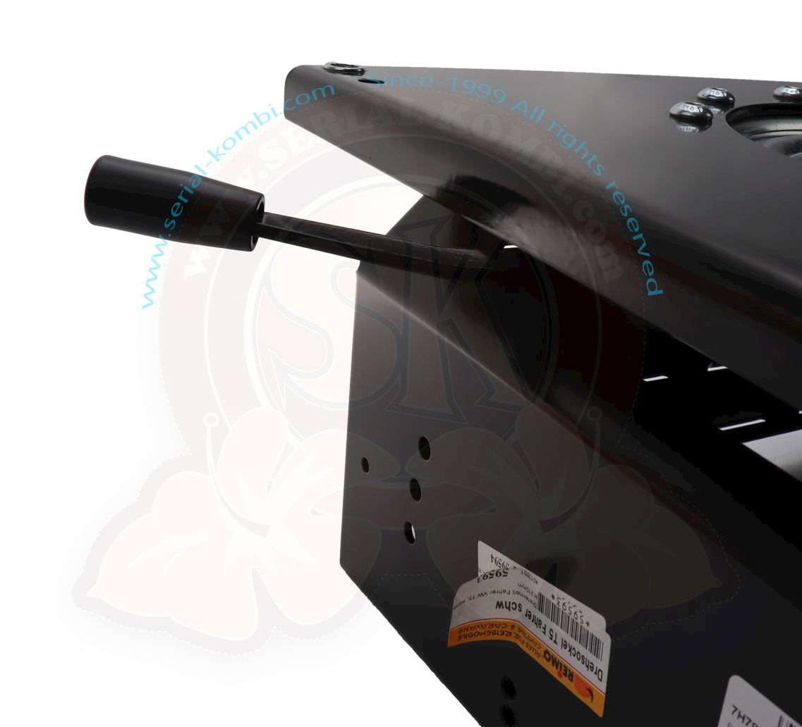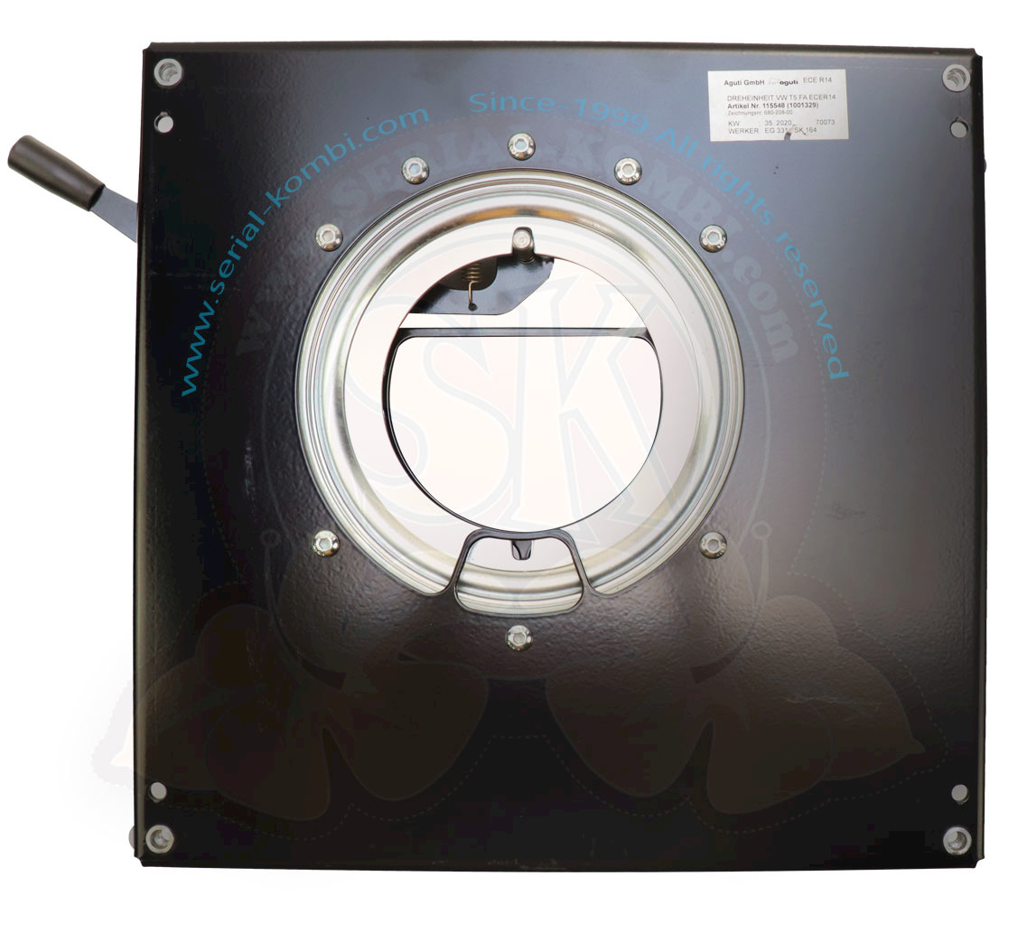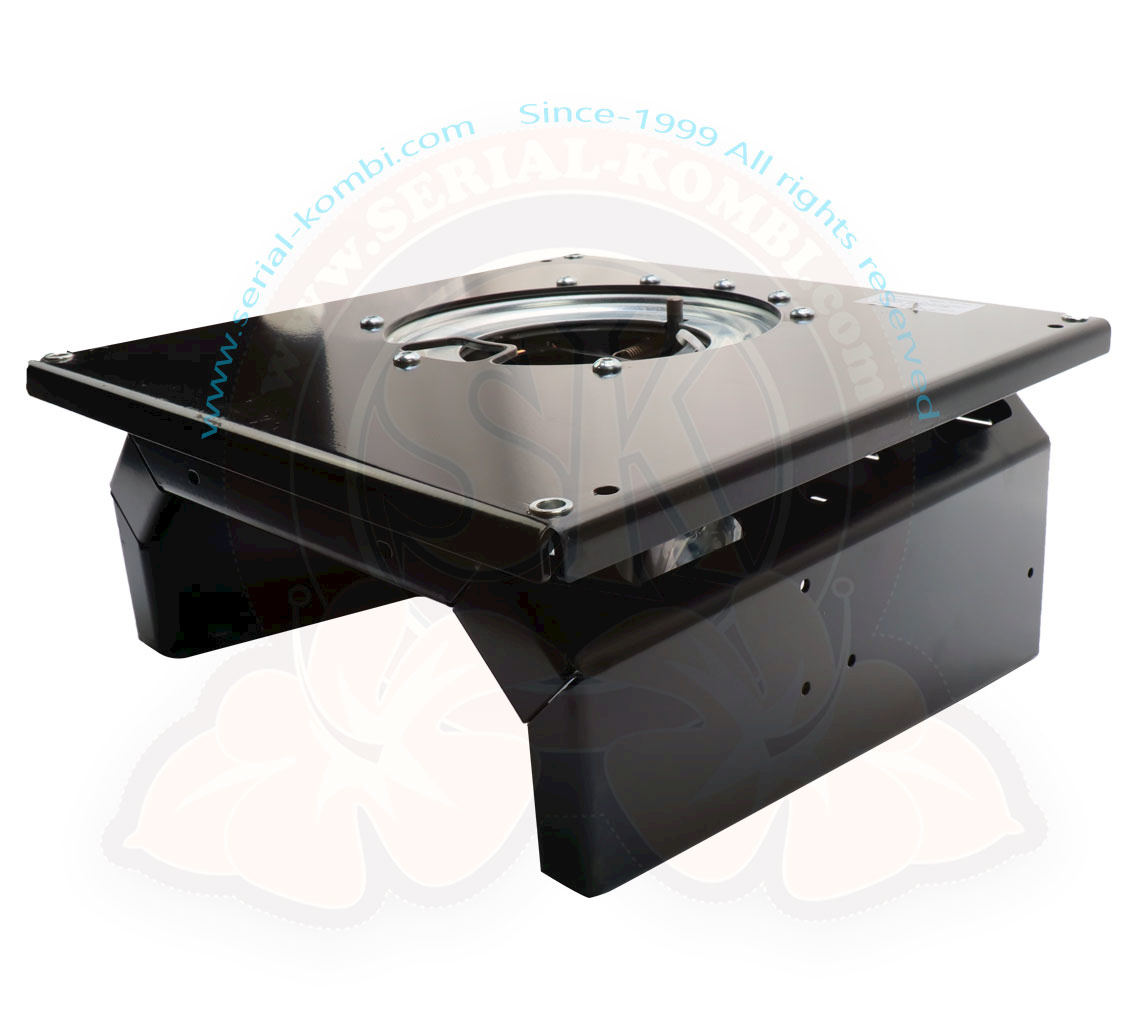 Swivel base for original seat driver’s side VW T5 and T6. Powder coated in black. Handbrake lever can be mounted individually. Locking in driving direction and in 180° position possible.