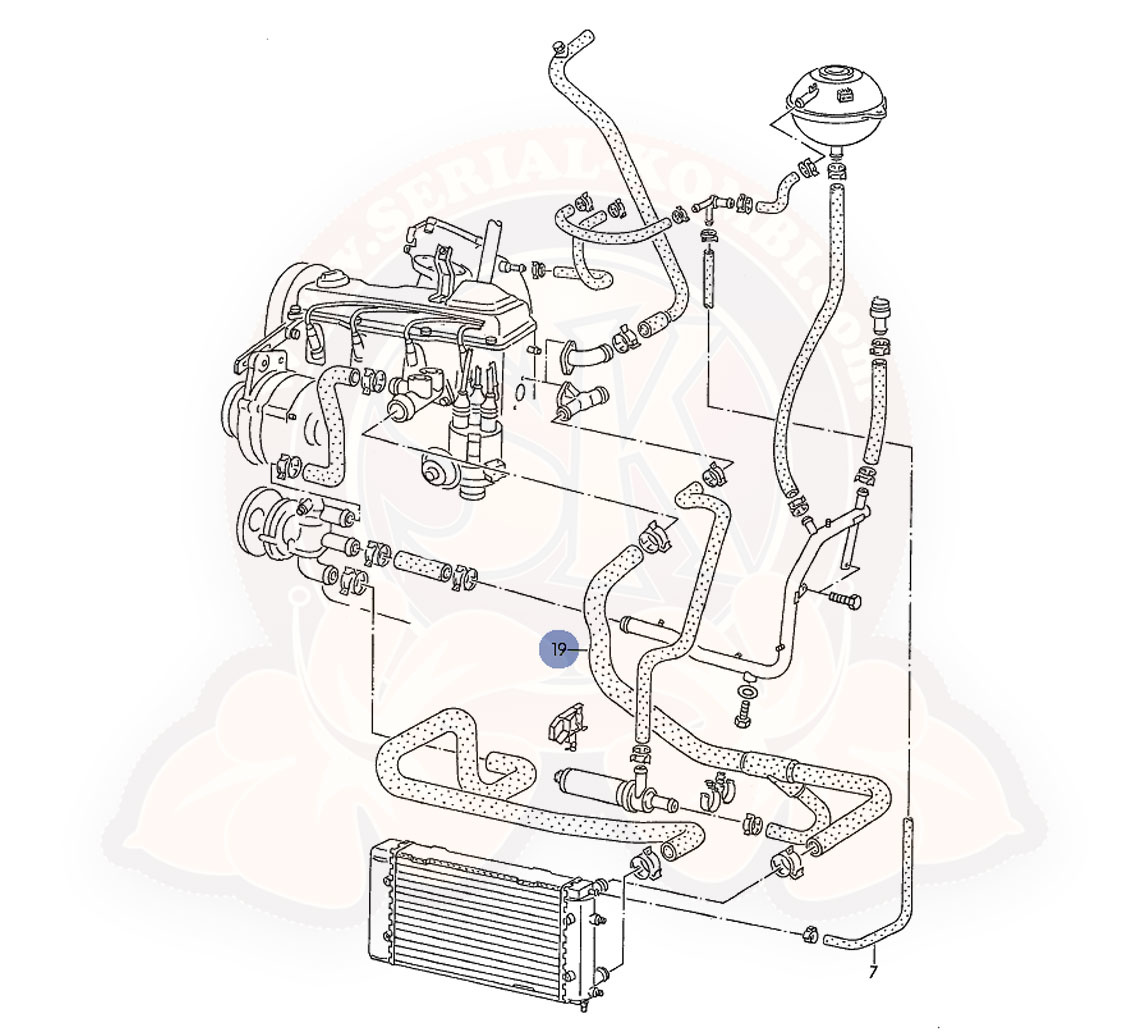 Water hose between flange and water radiator, T4 11/1991-6/2003 1800cc petrol