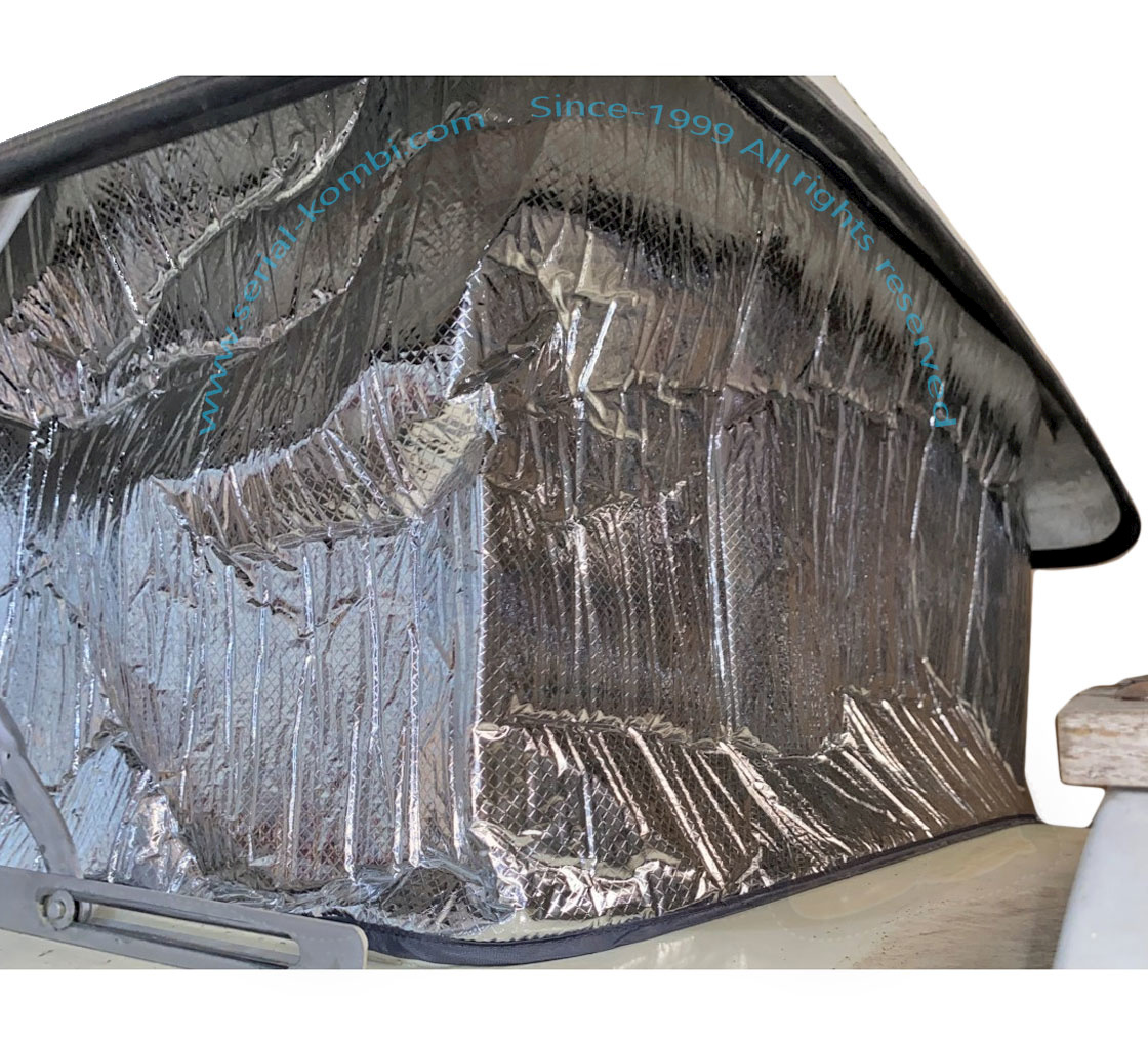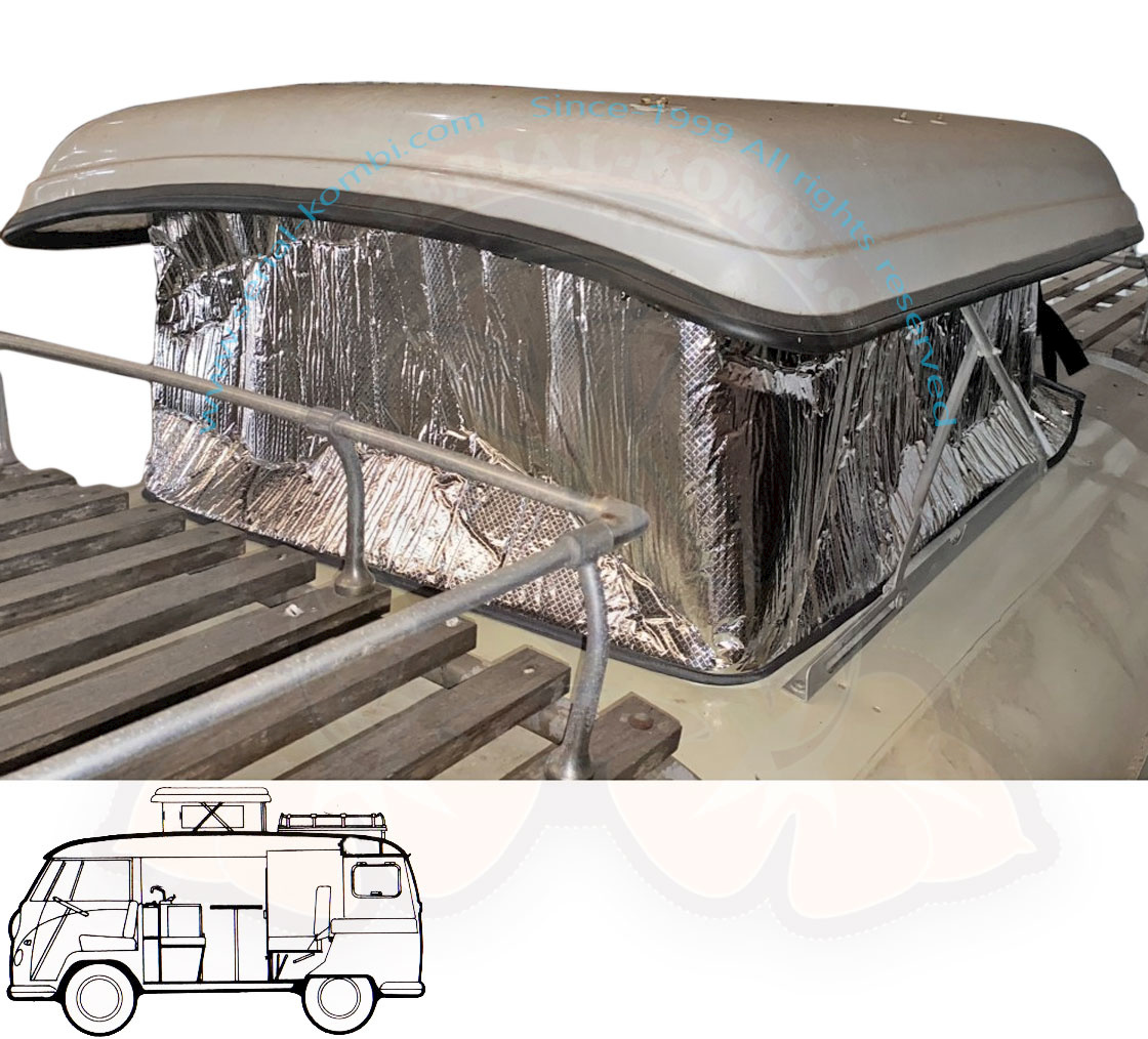Aislante térmico exterior de techo elevable para VW T1 Westfalia SO42. Se trata de un producto recién diseñado y hecho a medida que incluye un material especial que lo hace autoportante con correas de doble hebilla que permiten un ajuste fácil y apretado.
