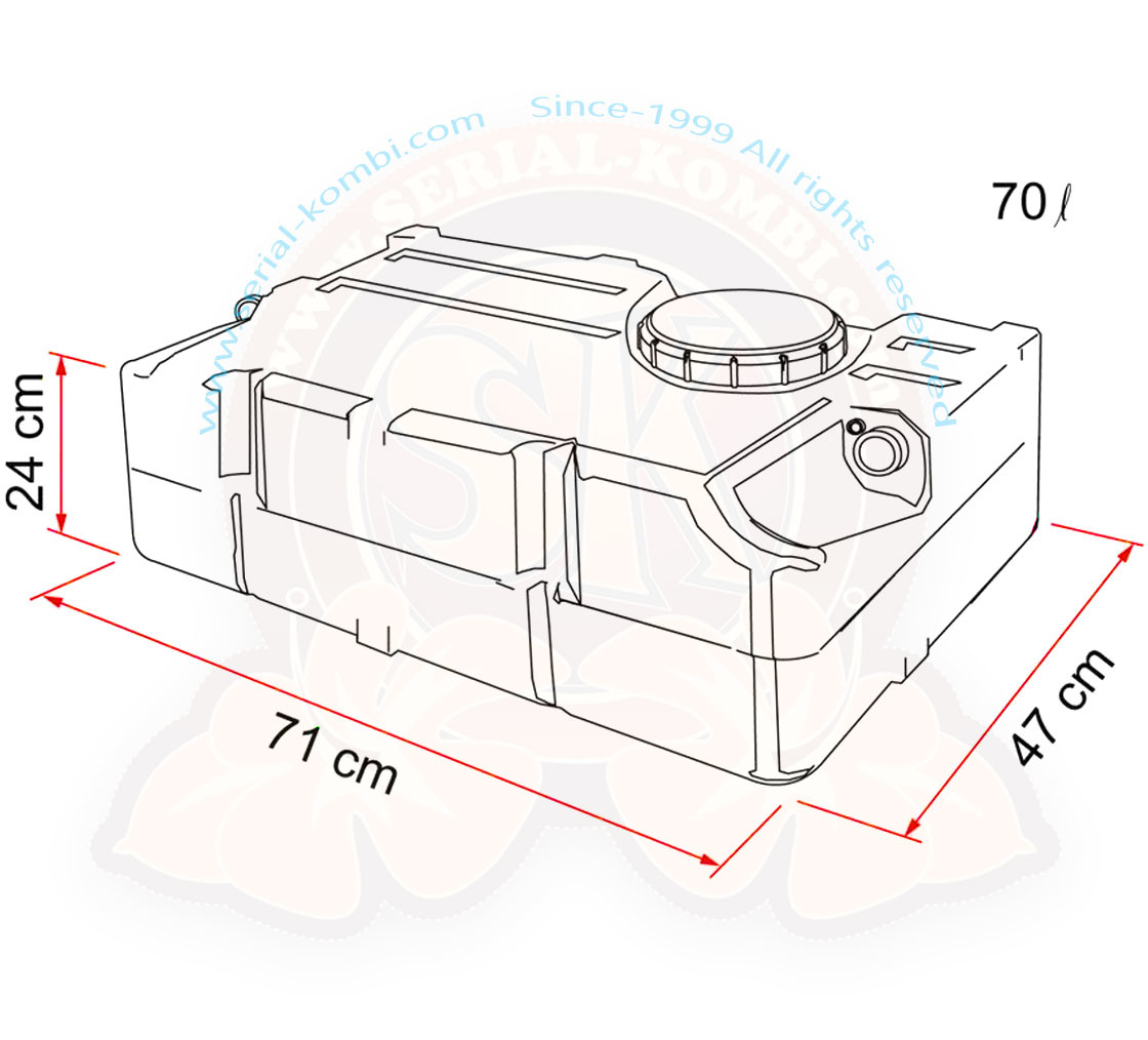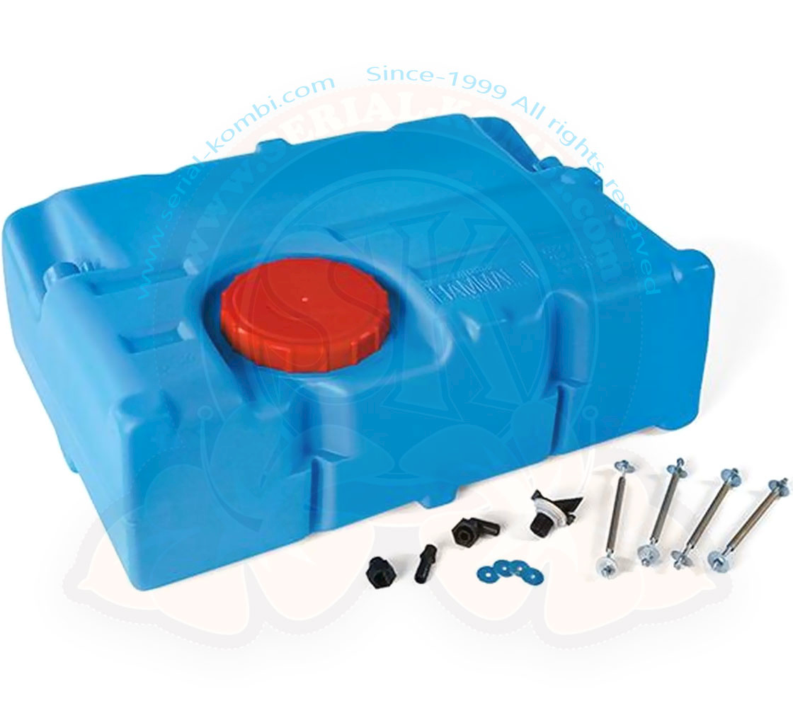 Tanque rígido fijo de agua potable de 70 litros hecho de material no tóxico. Puede instalarse vertical u horizontalmente. Sólo tiene 24 cm de altura y por lo tanto puede ser fácilmente deslizado en un baúl o debajo de una cama.