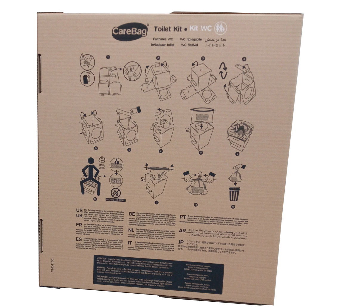 El CareBag® Folding Toilet Kit ha sido diseñado específicamente para uso móvil, donde no hay un inodoro funcional cerca o donde hay un deseo de ahorrar agua.