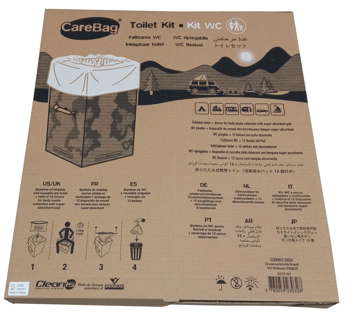 El CareBag® WC Kit es un sistema de WC seco plegable y reutilizable, portátil e higiénico para aplicaciones nómadas (exteriores), de navegación, pero también para aplicaciones colectivas.