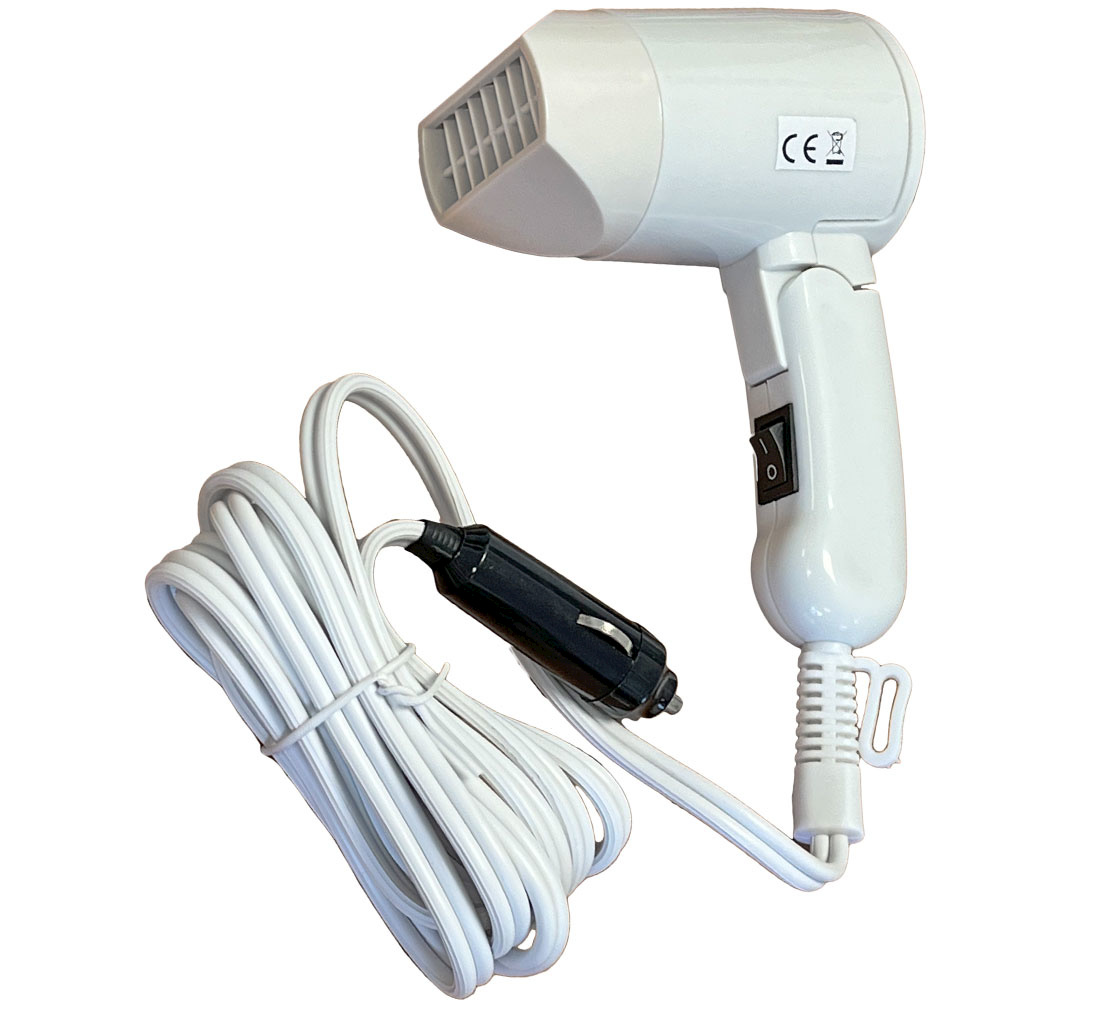Secador de pelo portátil de 12 voltios con mango plegable.