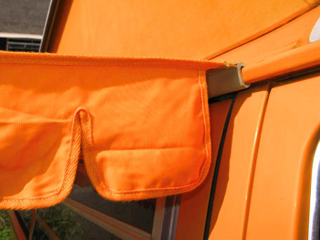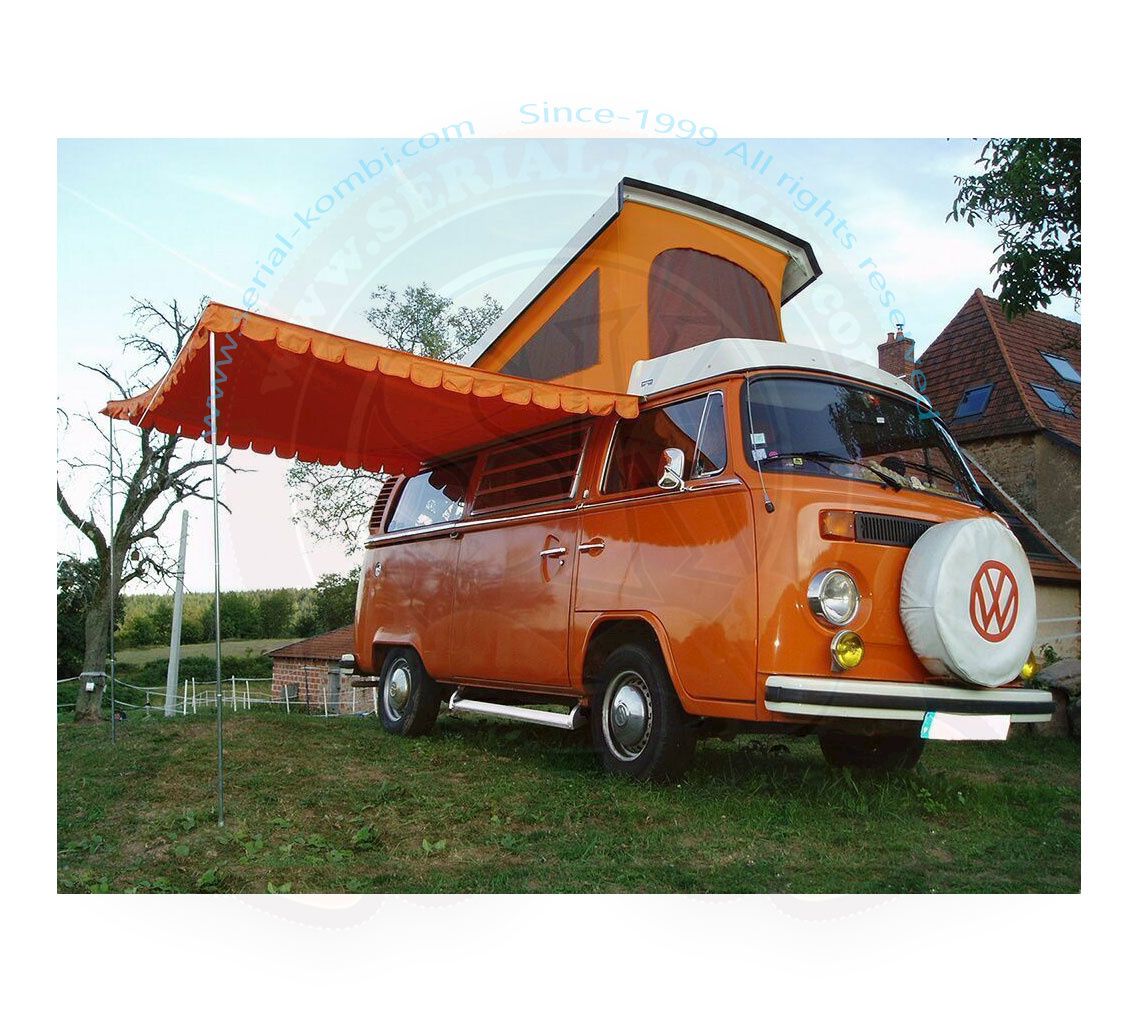 Tout nouveau auvent pare-soleil Style Westy pour Combi et Transporter, avec une retombée en forme de vagues sur les 3 faces. Toile 100% imperméable à l’eau de haute qualité, en Polycoton haute densité.