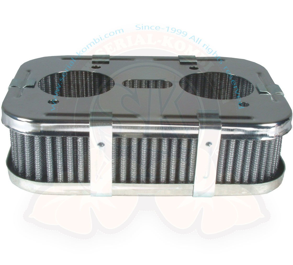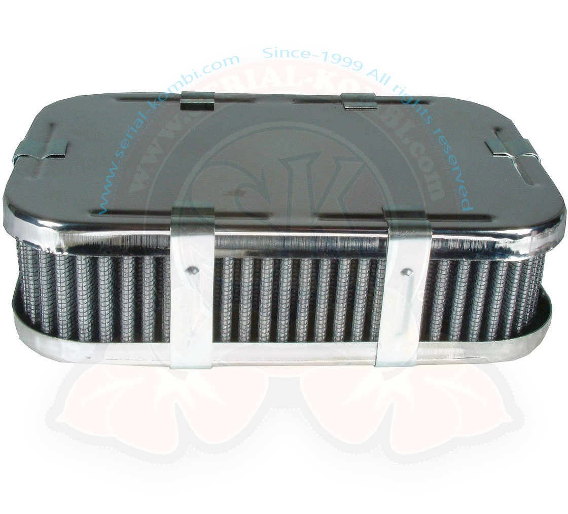 Filtre à air rectangulaire ‘ surbaissé ‘ (1-3/4 » de haut) pour utilisation sur les carburateurs IDF, Dellorto et HPMX 36-44mm. Livré avec un filtre en coton, la partie haute et baisse est chromée.