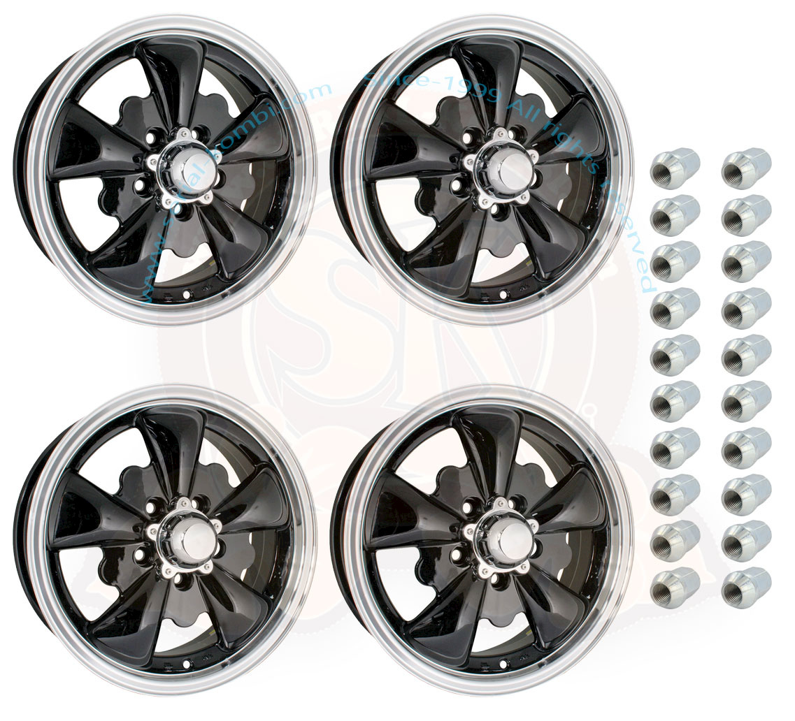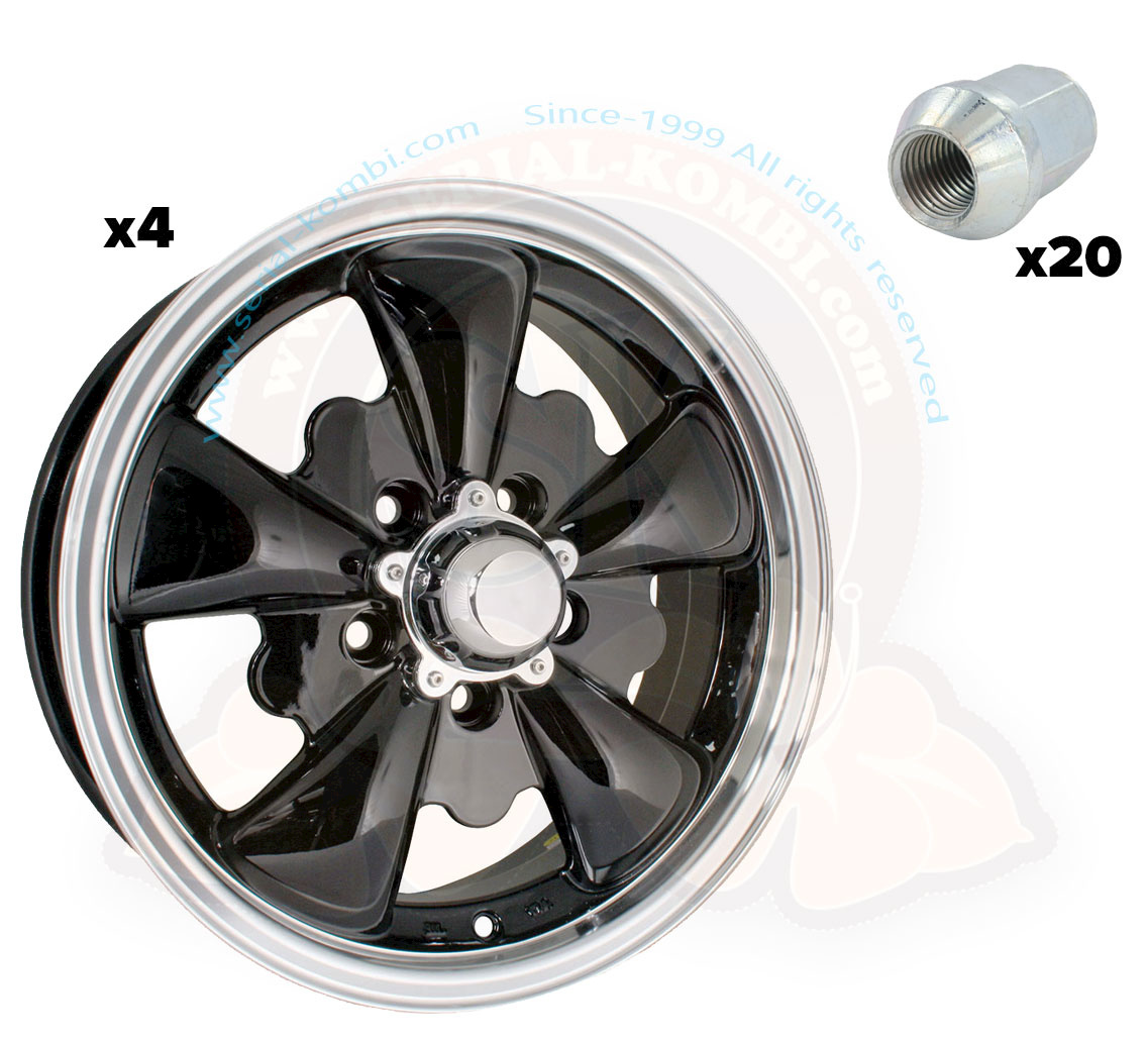 Jantes SSP GT 5 noires, perçage 5×112, dimensions 5.5×15″, déport ET20, 8/1970-7/1979 – kit de 4 avec cache-moyeu et 20 écrous coniques
