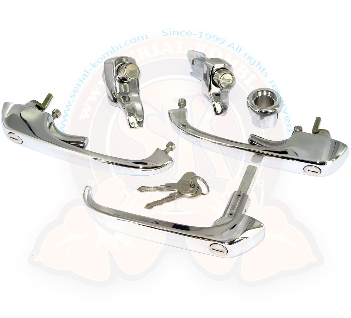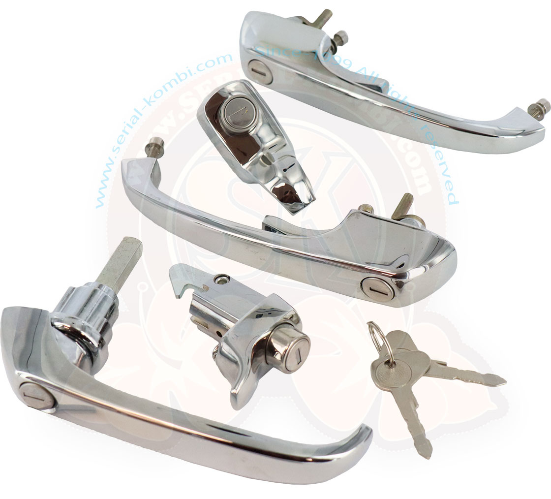 Pour Bay Window 8/1968-7/1971. Ensemble complet de poignées neuves et barillets conçus pour être utilisés avec une seule clef.
