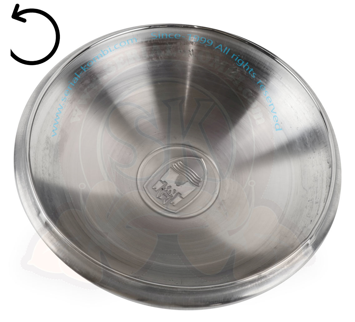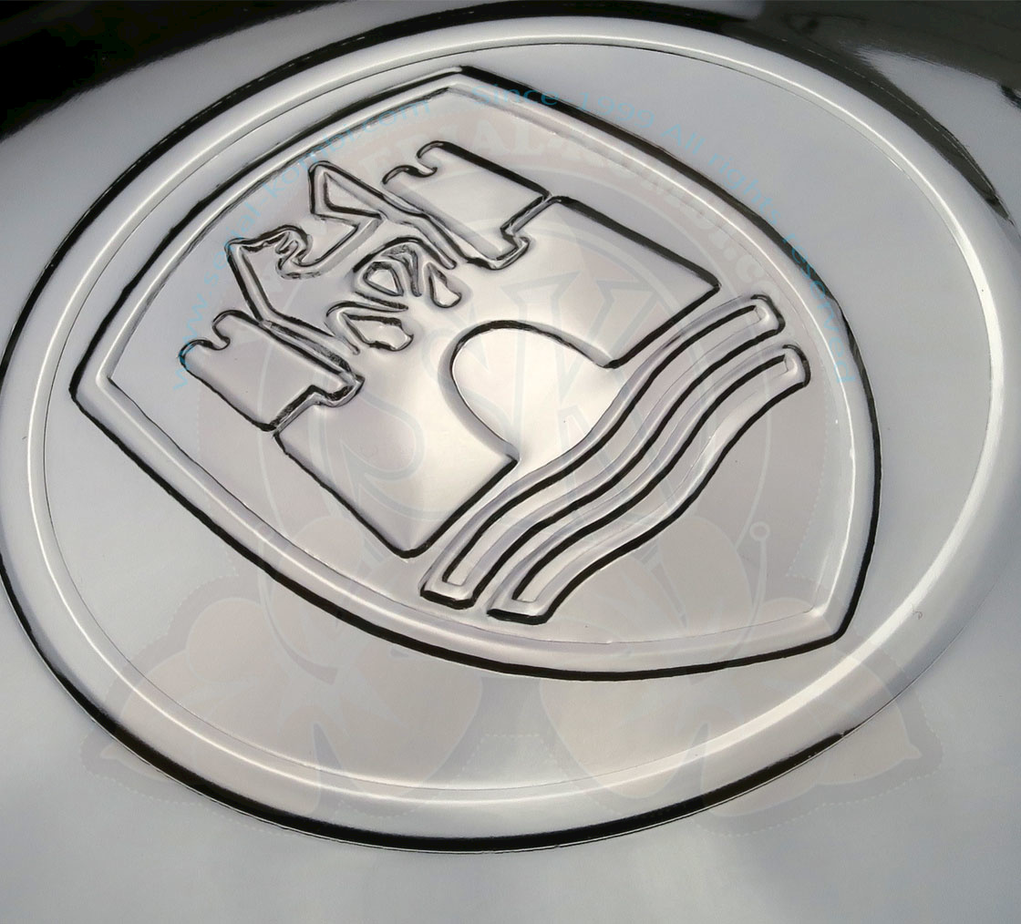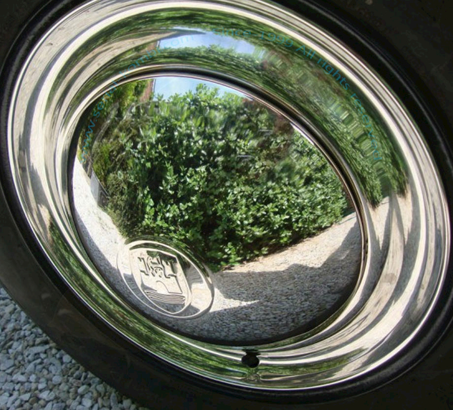 Borchia ruota bombata in inox lucidato con logo Wolfsburg, Maggiolino / Karmann Ghia -7/1965, Pescaccia (5x205mm) al pezzo