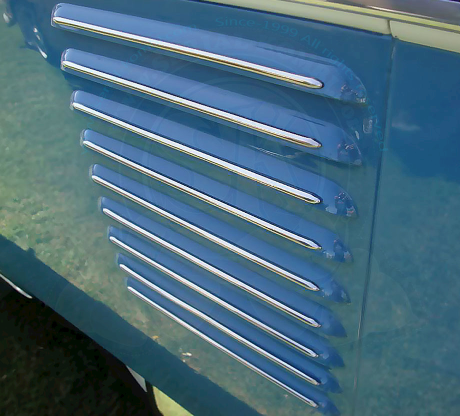 Kit completo per un bus, include 18 modanature per le alette di raffreddamento per bus Split da marzo 1955 a luglio 1955. Vendute solo in kit, con clip di fissaggio. Riproduzione molto bella in acciaio inox.