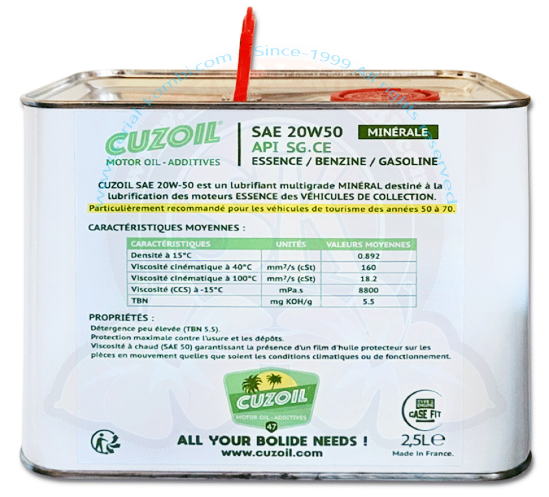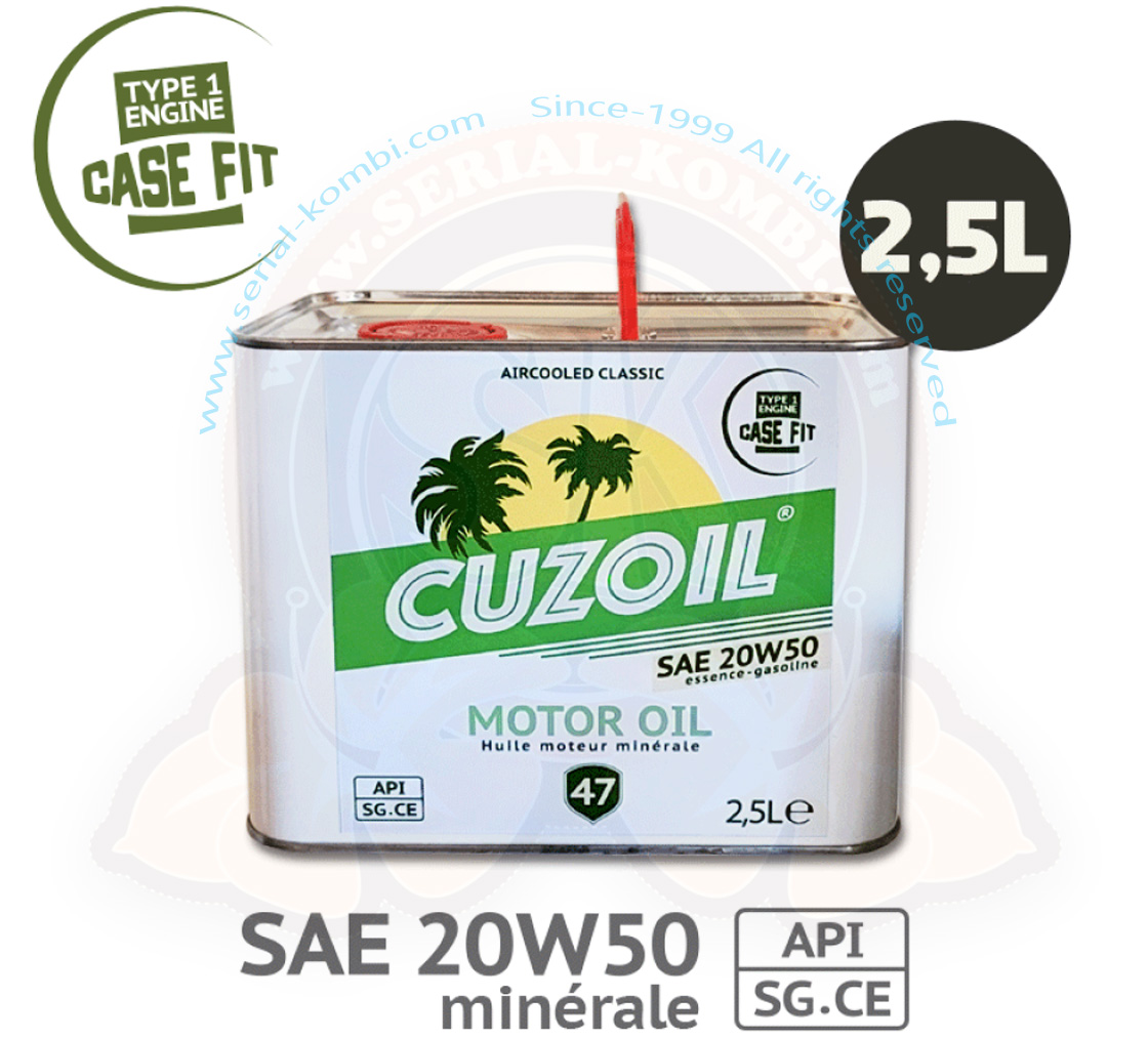Olio motore minerale, SAE 20W50, tanica metallica da 2.5 litri. L19 x l12,5 x H15cm, CUZOIL, lubrificante per motori a benzina. Prodotto in Francia