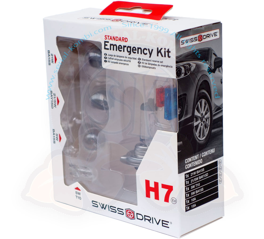 Kit di lampade di sicurezza composto da lampade con attacco P21W, P21/5W, W5W/T10, R5W e due fusibili da 10 e 15 amp.