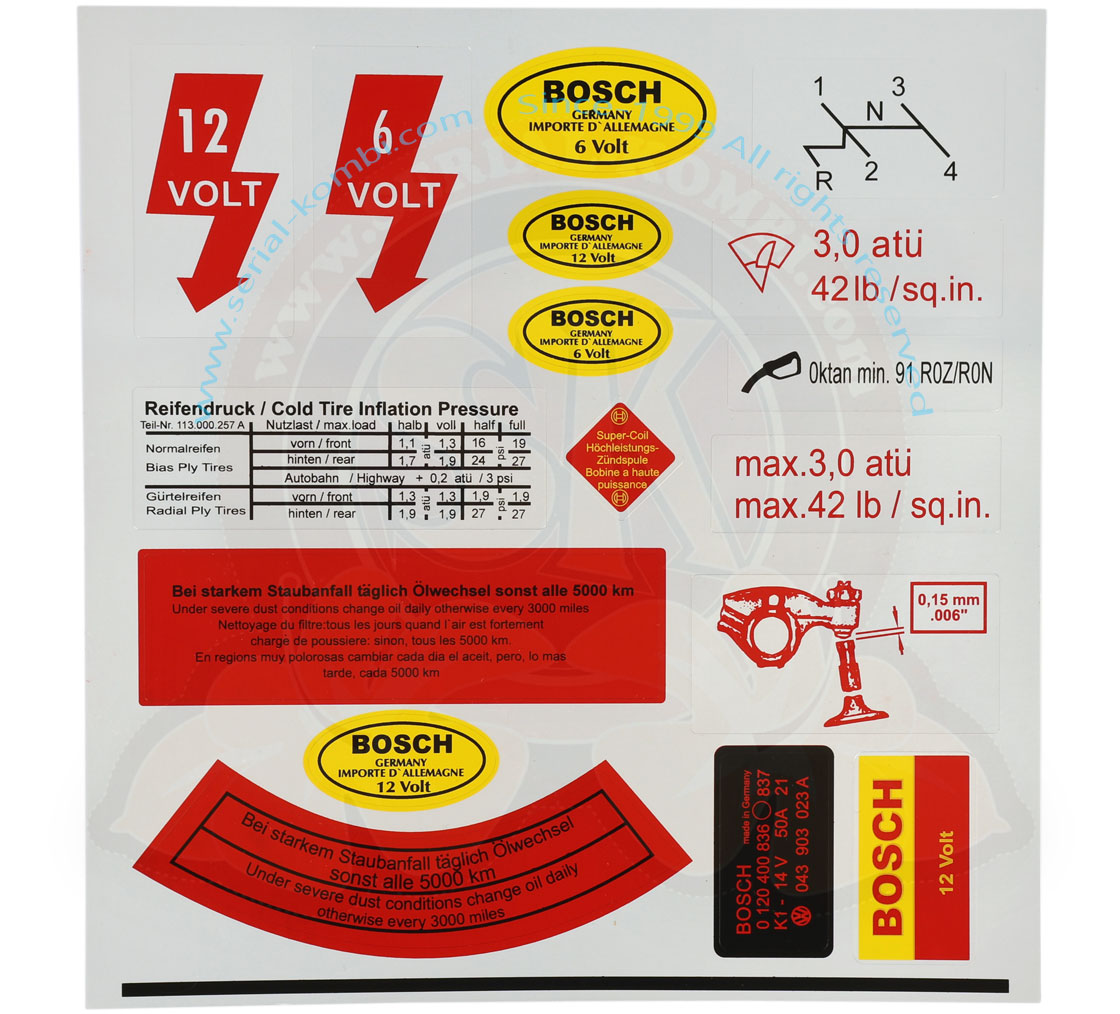 Set di 17 adesivi per motore e carrozzeria, Maggiolino / Karmann Ghia 6V e 12V