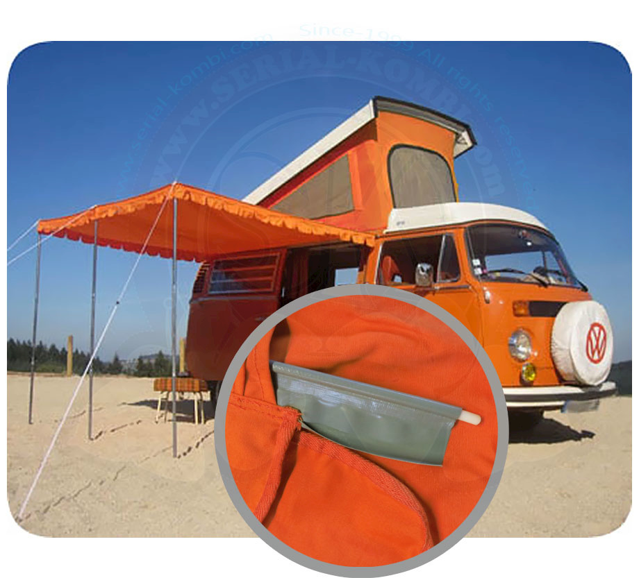 Il tendalino si fissa al veicolo grazie a un’asta che viene inserita in un’asola in tessuto del tendalino e bloccata nel gocciolatoio per mezzo di morsetti. L’asta e i morsetti sono inclusi nella fornitura.