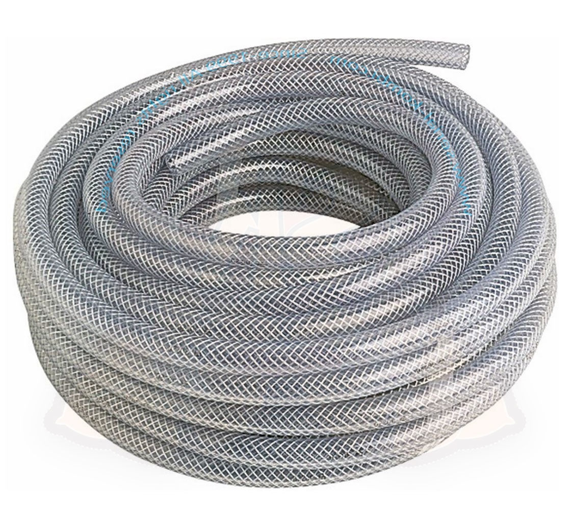 Design a tre strati, Tubo interno in PVC alimentare traslucido rinforzato con rivestimento tessile ad alta resistenza. Rivestimento in PVC traslucido.